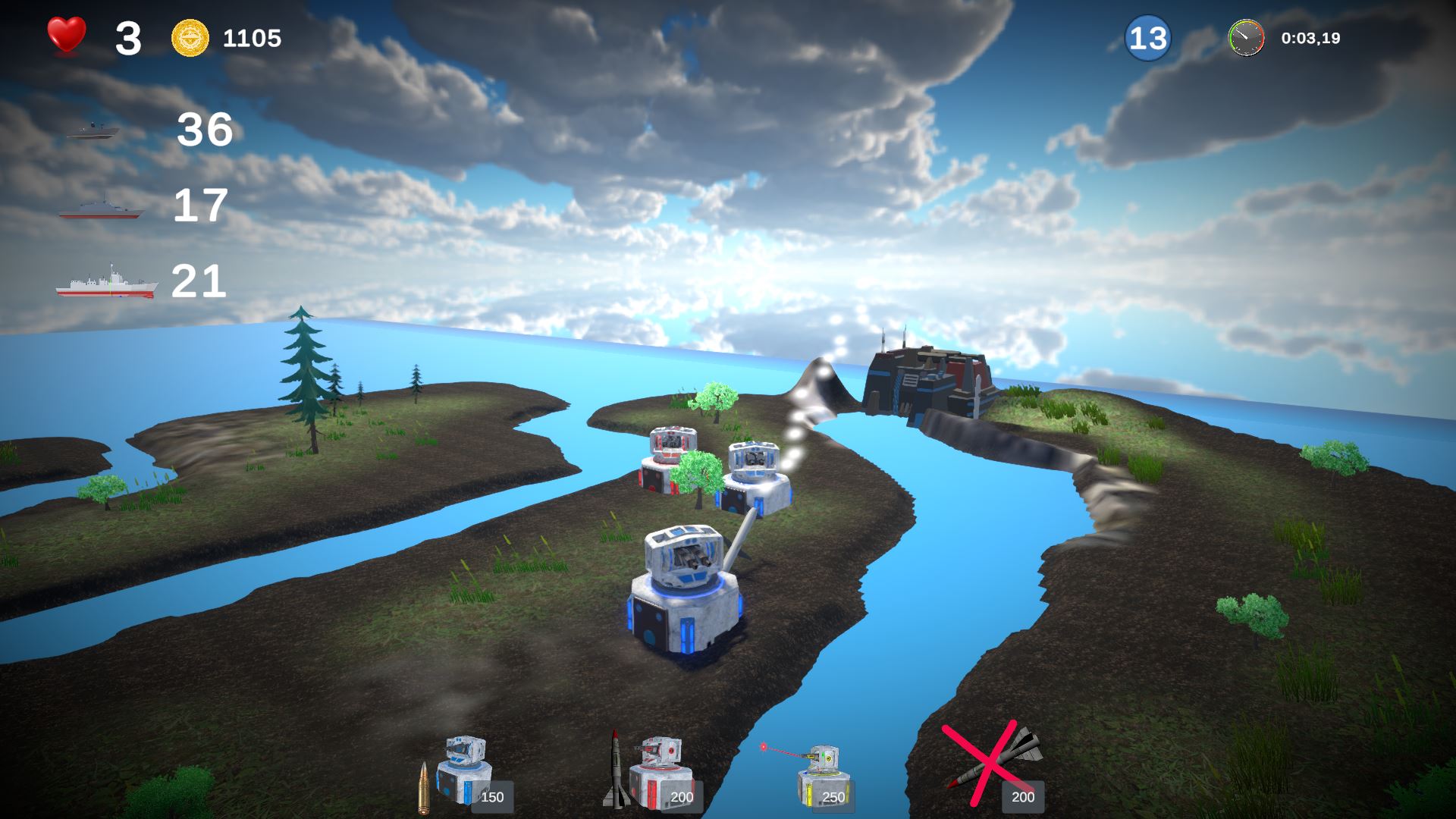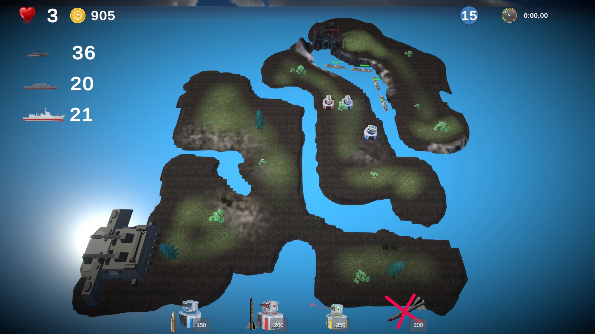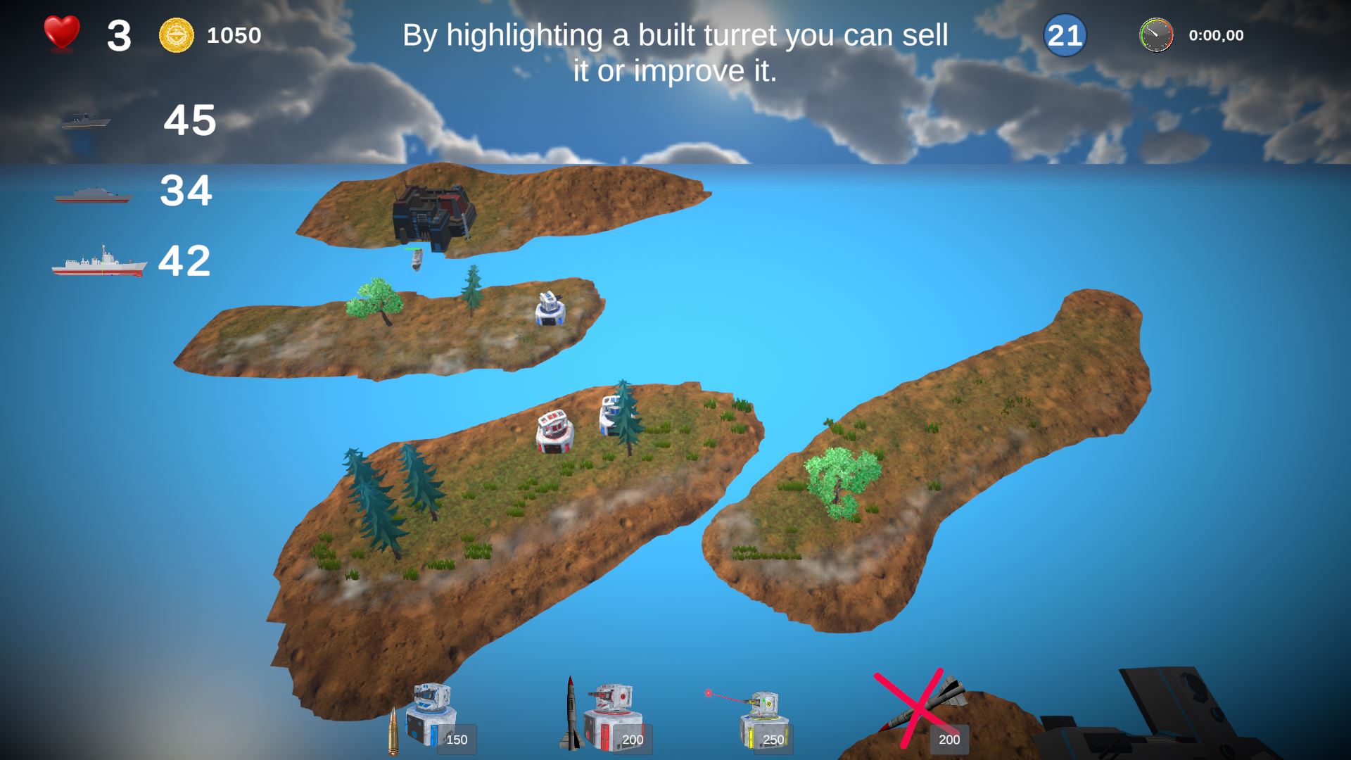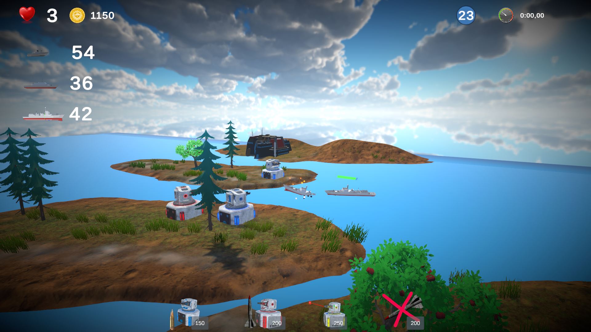 In this real-time strategy game, you must defend your headquarters from incoming enemy ships. Place artillery, missile, and laser towers on islands to stop the enemy and prevent your base from being captured. Earn points for each destroyed ship and spend them to upgrade your towers or build new ones. Careful planning and smart tower placement are the keys to surviving waves of attacks!