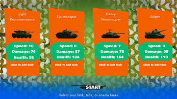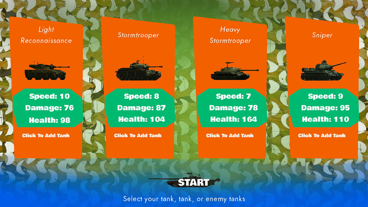 Choose your tank and battle opponents in thrilling combat! Each of the four tanks has unique stats, making every fight unpredictable. Face one or multiple AI-controlled enemies across three diverse arenas: lush forest, desert, or mysterious alien landscape. Collect power-ups to gain temporary advantages and secure victory. Use strategy, skill, and quick thinking to become the last tank standing!